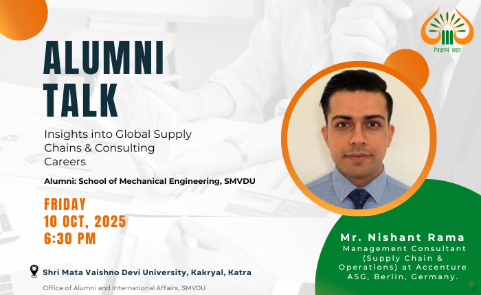 Mr. Nishant Raman, an alumnus of SMVDU (B.Tech Mechanical Engineering, Batch 2011–2015), will share his insights on global supply chain management, career pathways in consulting, and his professional journey from SMVDU to Europe.