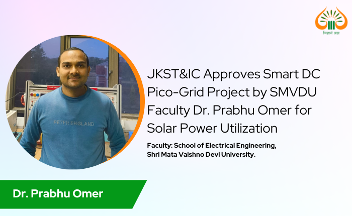 The Jammu & Kashmir Science Technology & Innovation Council (JKST&IC), Department of Science & Technology, has sanctioned a pioneering research project titled “Smart DC Pico-Grid for Direct Solar Power Utilization in Domestic Applications” under its Sponsored Research & Extension Program 2025-26. The project, led by Dr. Prabhu Omer from the School of Electrical Engineering, SMVD University, Katra, has been awarded a grant of ₹5 lakh for a two-year duration.
