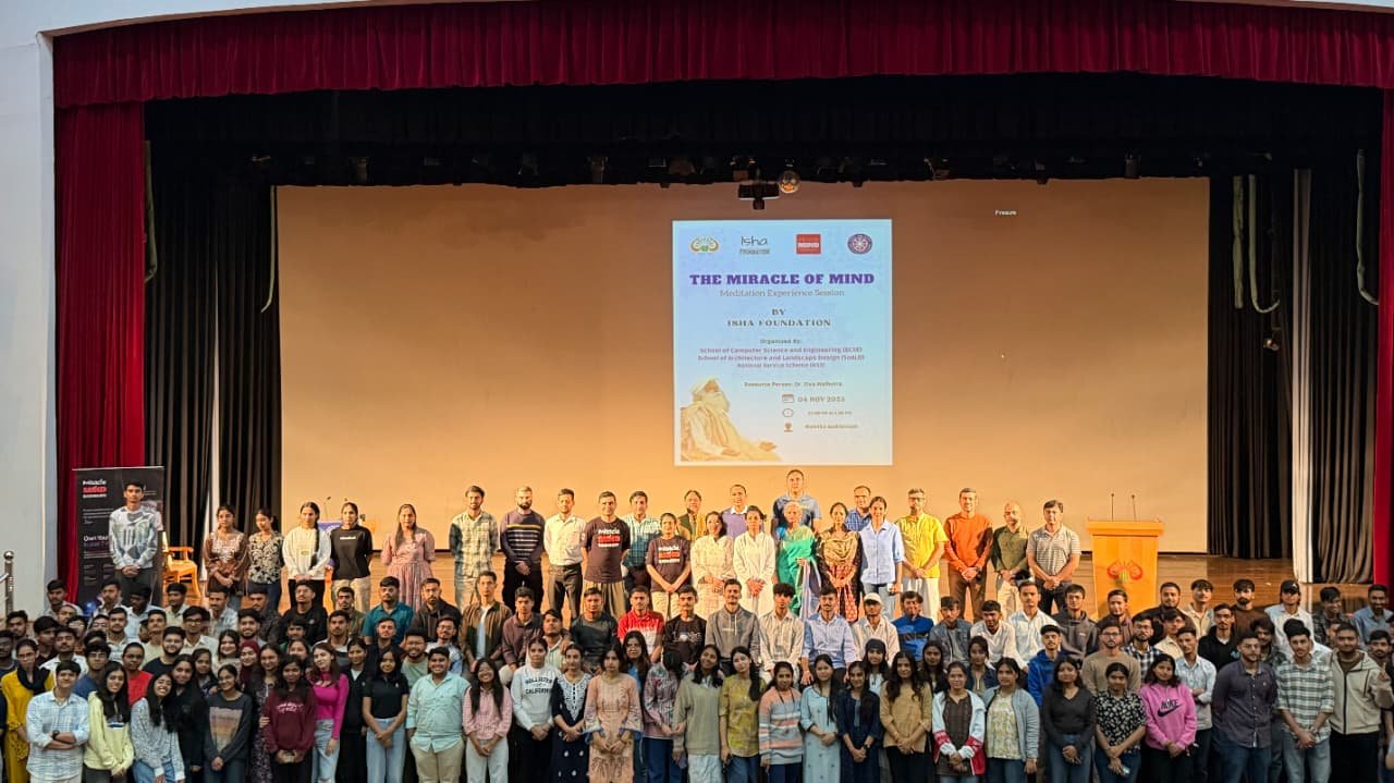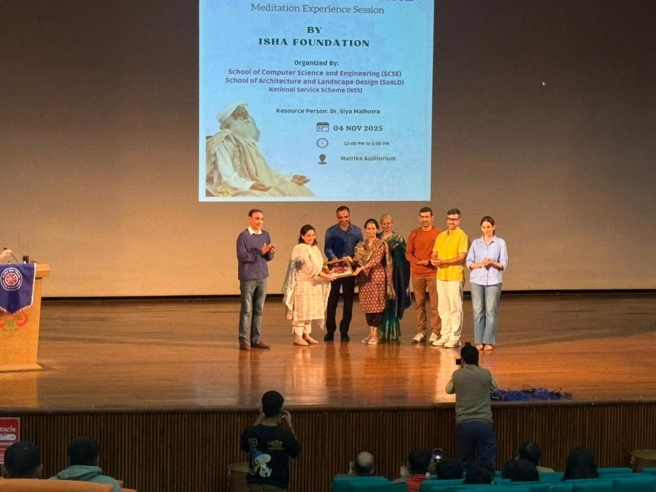 A transformative “Meditation Experience Session” was organized on 4th Nov’ 2025 by the School of Computer Science and Engineering (SoCSE), School of Architecture and Landscape Design (SoALD) and the National Service Scheme (NSS) unit of Shri Mata Vaishno Devi University (SMVDU) in collaboration with Isha Foundation. The session was held at the Matrika Auditorium, attracting enthusiastic participation from students, faculty members, scholars and staff.