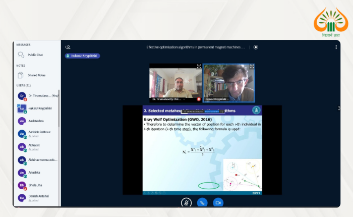 A one-day webinar on ‘Effective Optimization Algorithms in Permanent Magnet MachinesDesign’ was conducted at Shri Mata Vaishno Devi University, Katra. The webinar was organized by the School of Electrical Engineering, SMVDU, aiming to improve knowledge and research practices in the field of electrical engineering. The event began with an inaugural address by Dr. Tirumalasetty Chiranjeevi, Associate Professor, SoEE, who outlined the significance of the workshop from both the students and faculty’s perspectives. Following this, Dr. Ankireddy Narendra, Assistant Professor, SoEE, introduced the expert Dr. Łukasz KNYPINSKI, Assistant Professor of Poznan University of Technology, Poland. The program witnessed enthusiastic participation from all students, teaching and non-teaching members of SoEE including Prof. Bhola Jha, Dr. Kamal Deep, Dr. Prabhu Omer, Mr. Akash Deep, Mr. Shubham Chip and Dr. Vikram Kumar. Prof. Kumud Ranjan Jha, Dean Faculty of Engineering and HOD SoEE, extended his support for organizing the webinar. Dr. Łukasz KNYPINSKI’s presentation explores the application of metaheuristic optimization algorithms in the optimal design of electromagnetic devices. Algorithms such as Genetic Algorithms, Particle Swarm Optimization, Bat Algorithm, Gray Wolf Optimization, and Cuckoo Search have proven effective for solving complex constrained optimization problems, particularly when dealing with finite element method models that account for electromagnetic, thermal, and mechanical phenomena. Recent research shows a growing focus on heuristic and nature-inspired algorithms for designing permanent magnet motors, especially brushless DC and permanent magnet synchronous motors. The webinar was concluded with a vote of thanks by Dr. Jatinkumar Soni, Assistant Professor, SoEE.