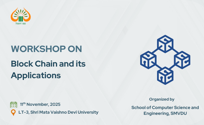 Shri Mata Vaishno Devi University is organizing a One-Day Workshop on “Blockchain and Its Applications” on November 11, 2025, at LT3, D-Block, SMVDU.