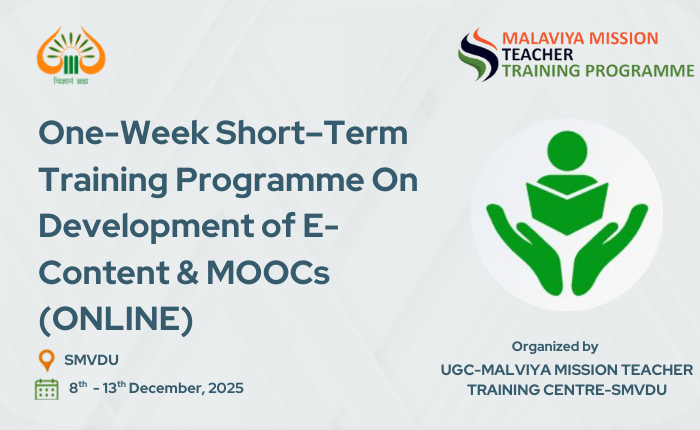 SMVDU is organising a One-Week Short-Term Training Programme on Development of E-Content & MOOCs, scheduled from 8th to 13th December 2025. The programme aims to equip faculty with essential skills in MOOC design, instructional planning, and e-content creation