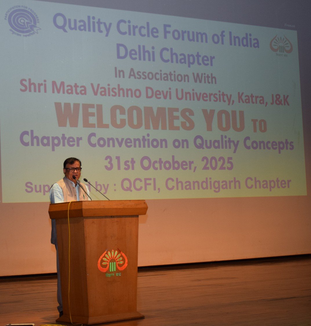 A one-day conference on “Quality Concepts” was organized at Shri Mata Vaishno Devi University (SMVDU) in collaboration with the Quality Circle Forum of India (QCFI), Delhi Chapter. The event commenced with the traditional lighting of the lamp and invocation to Goddess Saraswati. Delivering the welcome address, Mr. Anirudh Kaushik, Secretary, QCFI Delhi Chapter, said that the forum aims to reach academic institutions that are nurturing future generations with technical and intellectual excellence. He highlighted that over the past few years, QCFI has been organizing conferences in various engineering colleges and universities on Total Quality Management (TQM), Kaizen, Quality Circles, and 5S concepts to prepare the youth for future challenges.The Chief Guest of the inaugural session, Prof. (Dr.) Pragati Kumar, Vice-Chancellor,  SMVDU, emphasized the need to adopt the concept of quality across all sectors in India. He stated, “If educational institutions wish to contribute to the making of an Atmanirbhar Bharat (self-reliant India), they must embed quality principles into their institutional culture and daily practices.” Prof. Balbir Singh, Dean, Academic Affairs, spoke on improving the quality of life by applying the eight dimensions of quality given by Professor David A. Garvin, underscoring the broader relevance of quality concepts beyond industries. Providing details about the event, Mr. Anirudh Kaushik informed that this was the first QCFI conference of the year, with 51 teams representing 34 organizations participating. He expressed gratitude to all participating institutions. Mr. Avinash Upadhyay, Director (North India), QCFI, appreciated the significant contributions made by various organizations in promoting and implementing quality improvement initiatives. The Conference Convener and Chief Jury, Mr. Ganesh Upadhyay, stated that “the objective  of this platform is to promote mutual learning and a spirit of continuous improvement.” He  thanked all judges and organizing members for their support and shared an overview of the  event’s activities. In the valedictory session, the Chief Guest Mr. Ajay Kumar Sharma (JKAS), Registrar, SMVDU, spoke on the theme “Atmanirbhar Viksit Bharat” and emphasized that quality is not just a principle but should become an integral part of institutional culture. He appreciated the efforts of QCFI for spreading the message of quality across educational and industrial institutions. On this occasion, Mr. Neeraj Gupta (JKAS), Finance Officer, SMVDU, said that the university strives to make its students capable enough to face corporate challenges  confidently. Teams from Bharat Electronics, Minda Group, Tata Steel, Sandhar, Hero MotoCorp, Denso, Roop Polymers, Gabriel, Krishna Maruti and other leading organizations showcased their quality improvement projects through presentations. Outstanding teams were awarded by QCFI for their exemplary work. Students of SMVDU also presented captivating cultural performances during the event. Mr. B.K. Bhatia, along with various professors and student volunteers, contributed as observers and coordinators. The successful execution of the conference was made possible through the dedicated support of QCFI staff members Mr. Ashwini and Mr. Santosh, as well as the university’s IT Team, Electricity Department, Auditorium Team, and Support Staff.