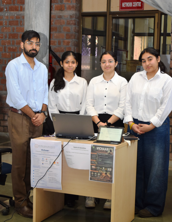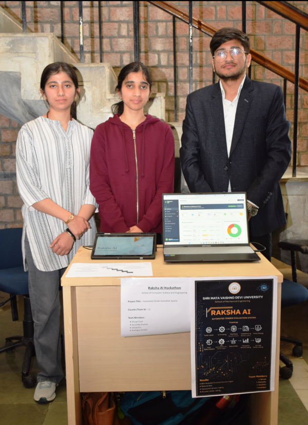 Students of the B.Tech. Robotics and Artificial Intelligence program at Shri Mata Vaishno Devi University (SMVDU) secured Second Position at Raksha AI, a hackathon organized by the School of Computer Science and Engineering to promote the development of Artificial Intelligence-based solutions for defense applications.