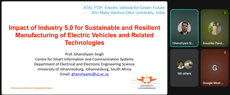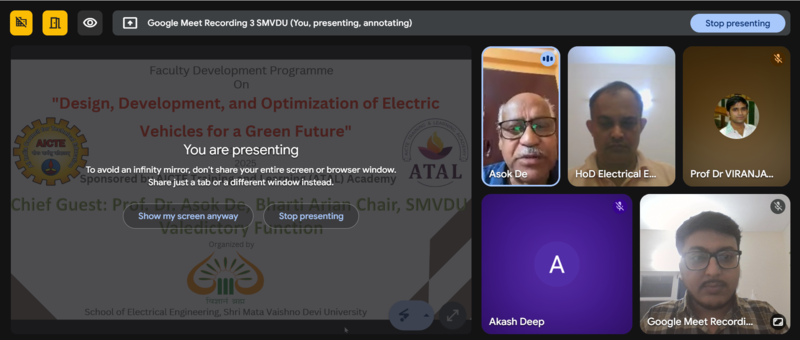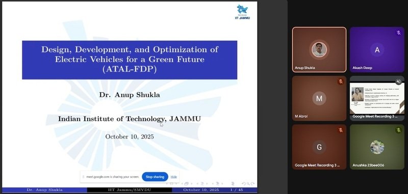 The School of Electrical Engineering (SoEE), Shri Mata Vaishno Devi University (SMVDU), Katra, successfully organized a six-day AICTE-ATAL Online Faculty Development Programme (FDP) on “Design, Development, and Optimization of Electric Vehicles for a Green Future” from 6th–11th October 2025 under the AICTE Training and Learning (ATAL) Academy 2025–26 schedule.