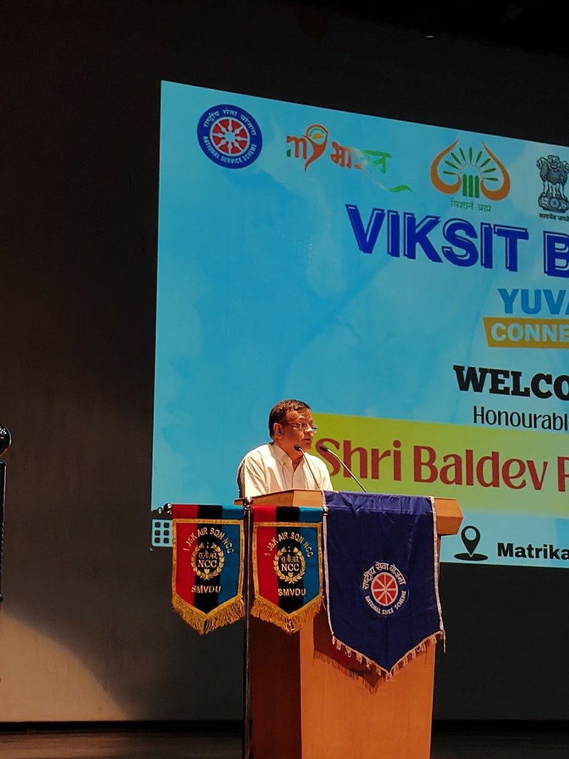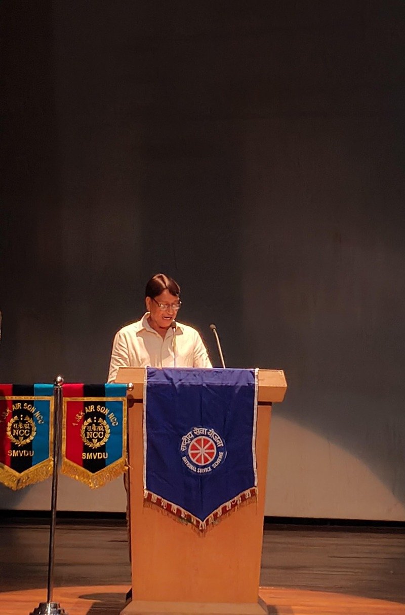 Sh. Baldev Raj Sharma, Hon’ble Member of the Legislative Assembly, Jammu and Kashmir, graced the occasion as the Chief Guest, inspiring students with his motivating words on the role of youth in shaping a developed India. Prof. Pragati Kumar, Hon’ble Vice-Chancellor, SMVDU, also addressed the gathering and encouraged students to actively engage in nation-building activities through creative and intellectual contributions.