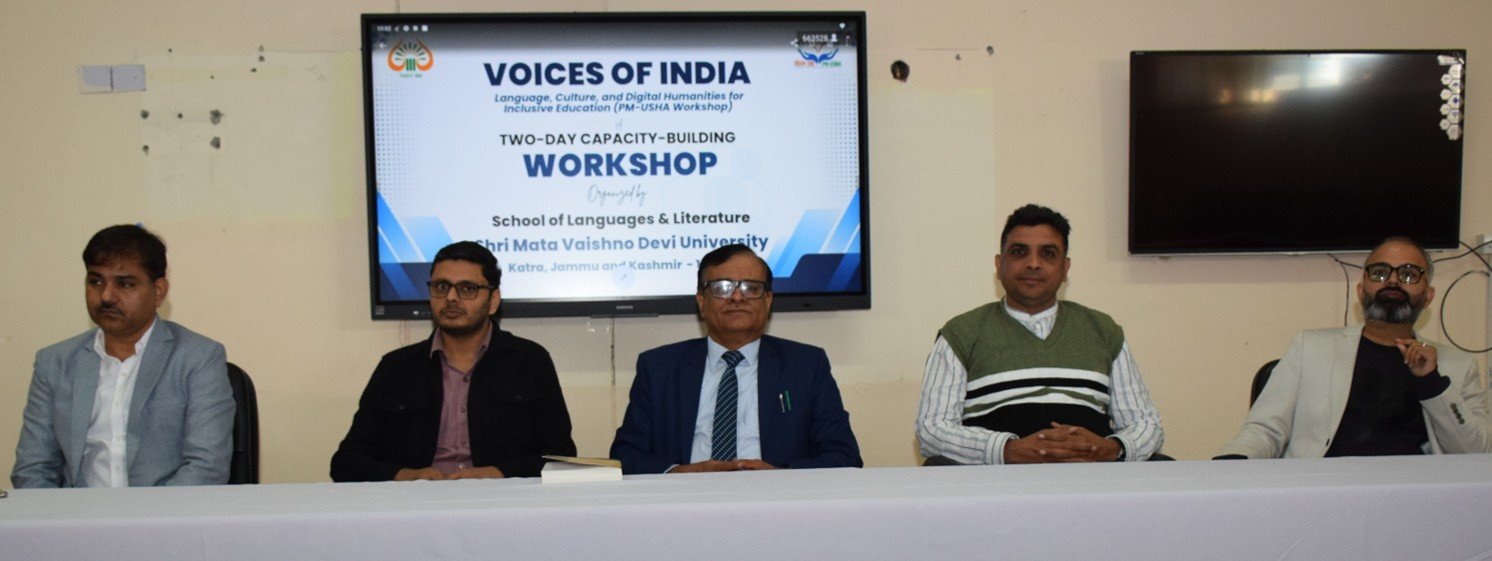 The School of Languages and Literature, Shri Mata Vaishno Devi University (SMVDU), inaugurated a two-day workshop on “Voices of India: Language, Culture, and Digital Humanities for Inclusive Education” on November 10, 2025. The workshop aims to explore the intersections of India’s linguistic diversity, cultural expressions, and digital tools in promoting inclusive and equitable education. The inaugural session commenced with the arrival of guests and an invocation, followed by a welcome address by Dr. Anurag Kumar, Head, School of Languages and Literature, and Programme Coordinator. Dr. Kumar highlighted the significance of integrating language, culture, and technology to strengthen inclusive educational practices. Dr. Amitabh V. Dwivedi, Dean, Faculty of Humanities and Social Sciences, emphasized the importance of linguistic plurality and the need for culturally responsive pedagogy. Honourable Vice Chancellor, Prof. Pragati Kumar, graced the occasion as the Chief Guest. In his address, he lauded the School’s initiative and underscored the value of digital humanities in preserving and disseminating India’s rich cultural heritage.The workshop brings together distinguished experts including Prof. Sunil Der from the Central University of Gujarat, Prof. Anil Kumar from the Central University of Himachal Pradesh, Dr. K. K. Pandey from the Ministry of Education, Dr. Amitash Ojha from IIT Jammu, and Dr. Subhash Chander from the University of Jammu. These eminent scholars will share their insights across various sessions on language, culture, and digital innovation in education. The inaugural session concluded with a vote of thanks proposed by Dr. Manpreet Sharma, Convener of the workshop, followed by a group photo session. The two-day event will continue with thematic sessions, expert interactions, and scholarly discussions designed to foster collaborative approaches toward inclusive education in India.